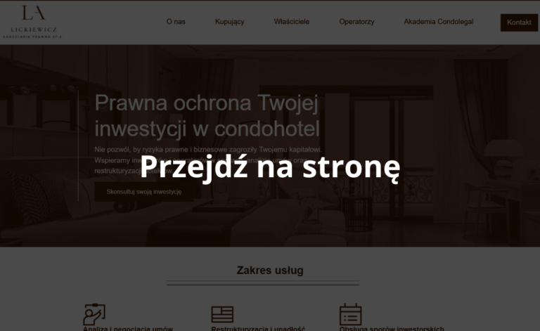 Sprawy dotyczące inwestycji w condohotele wymagają nie tylko znajomości samych umów, ale także zrozumienia całego modelu inwestycji, wzajemnych zależności między stronami i ryzyk, które mogą ujawniać się dopiero na dalszym etapie. Dla klienta oznacza to potrzebę uzyskania jasnej odpowiedzi, czy jego środki są właściwie zabezpieczone, jakie zagrożenia wynikają z dokumentacji i jakie działania warto podjąć, aby ograniczyć ryzyko strat. Właśnie dlatego stworzyliśmy CondoLegal — dedykowaną przestrzeń tej specjalizacji, w której szerzej opisujemy najczęstsze problemy uczestników rynku condo, zakres wsparcia kancelarii i możliwe ścieżki działania. To miejsce dla osób, które chcą lepiej zrozumieć swoją sytuację jeszcze przed podpisaniem umowy, a także dla tych, którzy już mierzą się z problemami dotyczącymi inwestycji, operatora, rozliczeń albo dochodzenia roszczeń. Przejście na CondoLegal pozwala szybciej odnaleźć informacje dopasowane do konkretnego etapu inwestycji i rodzaju problemu, z którym klient zgłasza się po pomoc.